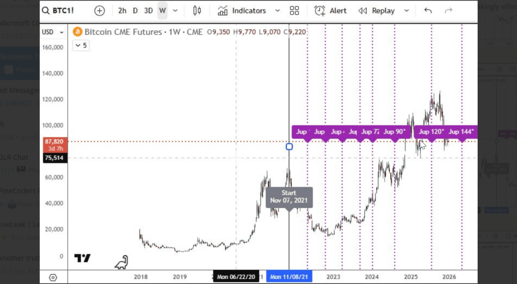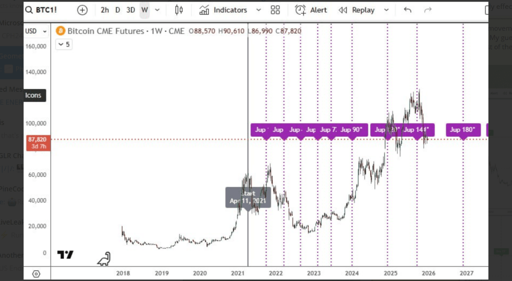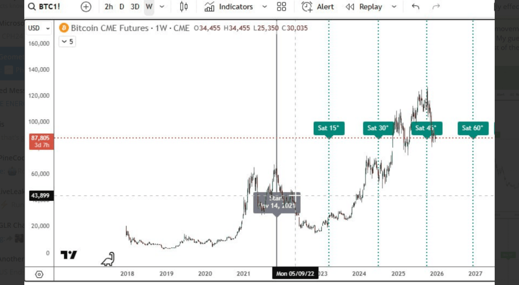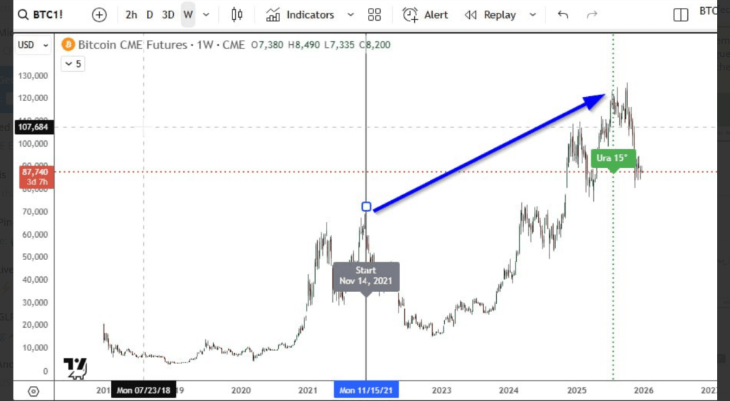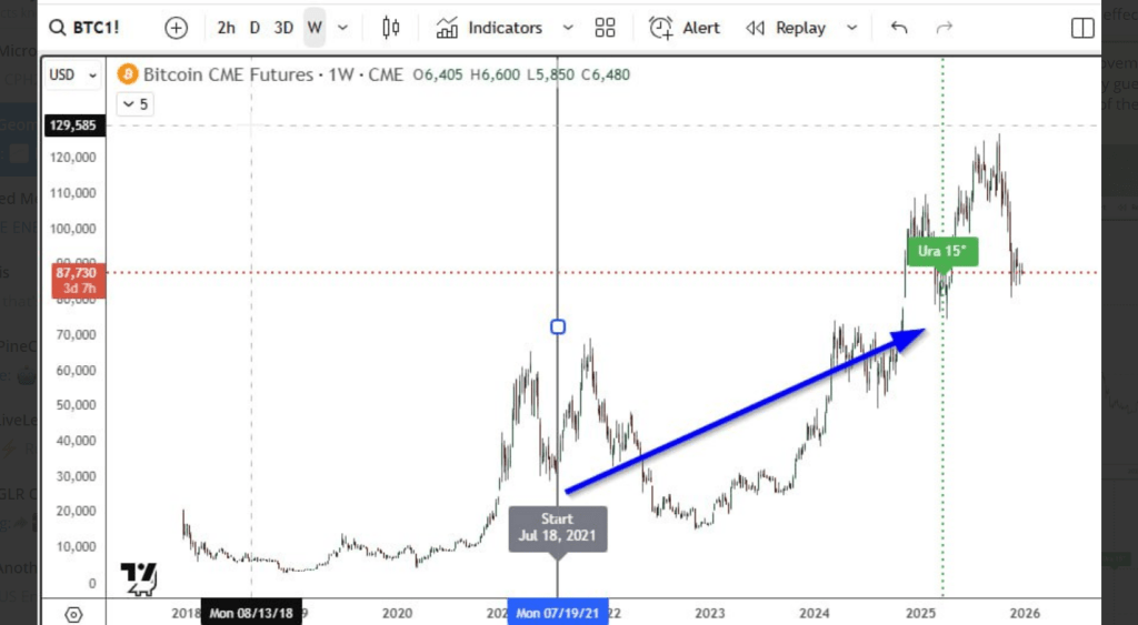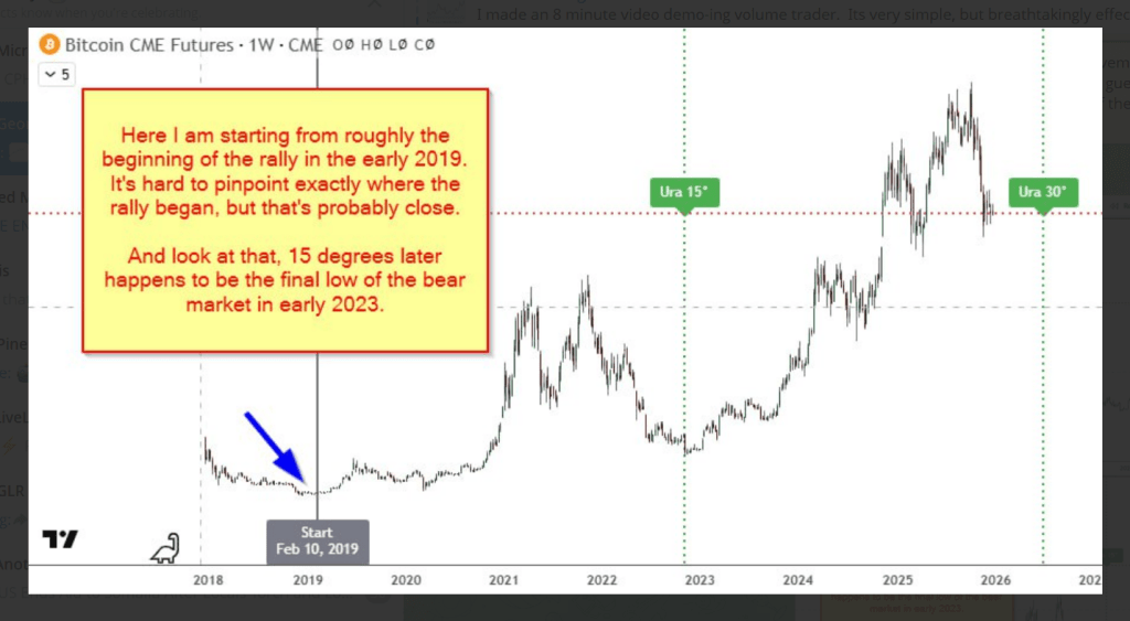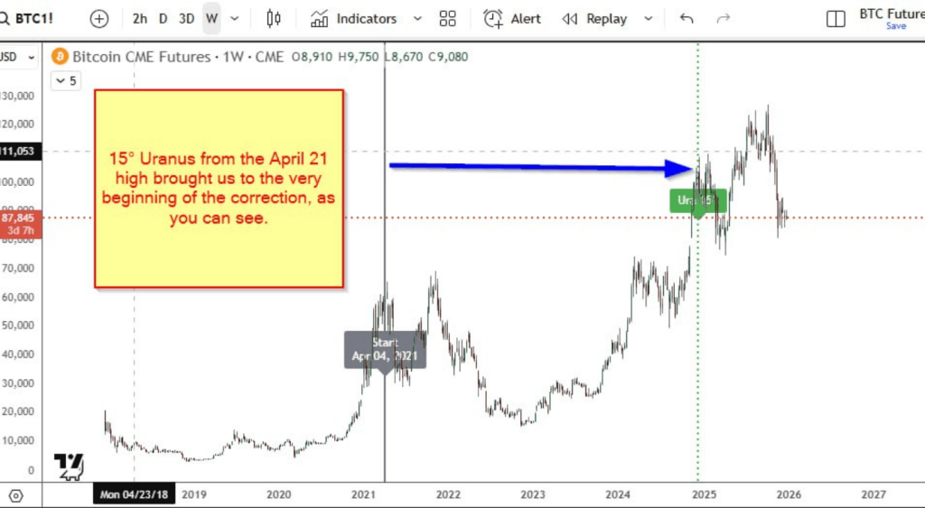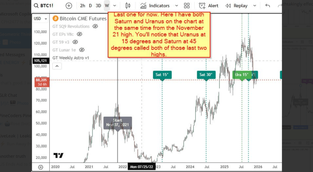 Let’s put both Saturn and Uranus on the chart at the very same time. Starting them both at that November 21 high. Would you look at this? Both of those two highs at the end of 2024 were called almost precisely by Saturn and Uranus.