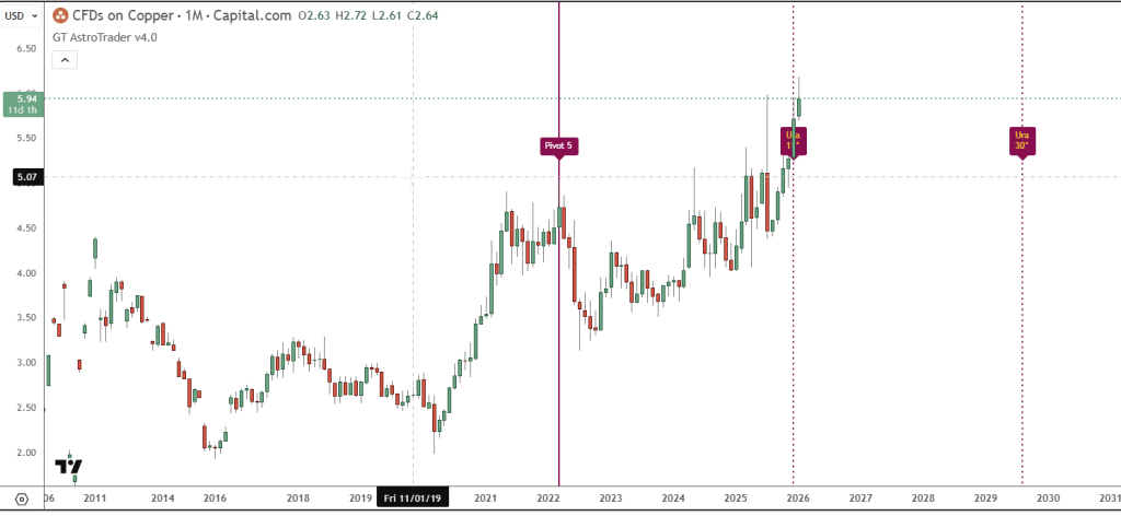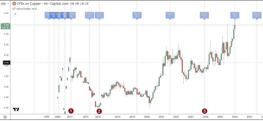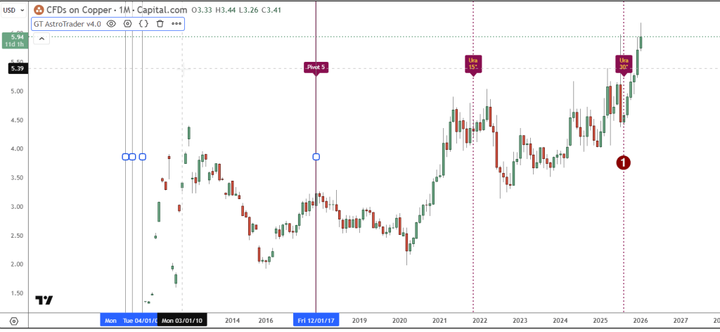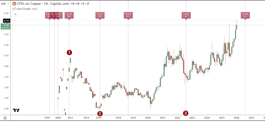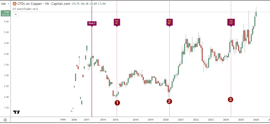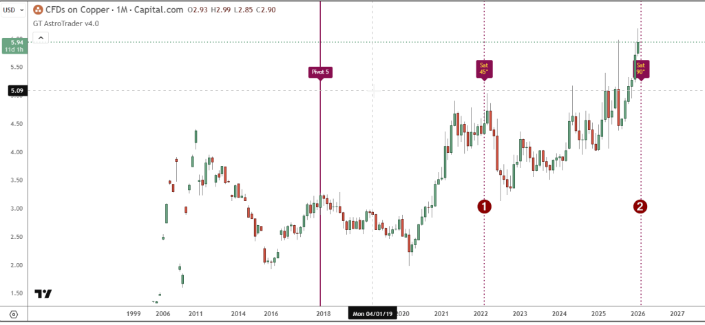 Continuing, if we move our starting point to the high shown above, we see that 15 degrees of Uranus later, we arrive at one month ago. If you are still long copper when you see this, do you think it might be a good idea to take some money off the table? Not sure yet? Let’s also consider the following setup, which shows a hit in one month, using 45 degrees of Saturn.